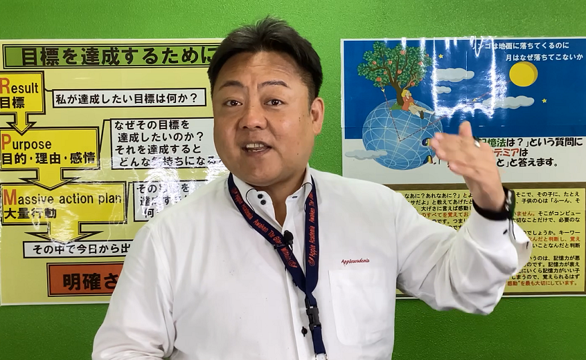 アップルアカデミアのホームページへお越しいただき、誠にありがとうございます。 アップルアカデミアでは、『アップルアカデミアに通う子どもたちを夢を語り、夢を叶える大人にする』ための応援、サポートをしています。 アップルアカデミアでは、いかに確実に成果を出すか?という学習方法、受験のための解法やノウハウを提供しています。 さらに、実際に行動してもらうための行動科学に基づいたコーチングスキルを活用し、感情を味方につけ、モチベーションを上げるための仕掛け、仕組みを提供しています。 アップルアカデミアでは、子どもたちが授業中に思わず声を上げたくなったり、身を乗り出して、頭をフル回転させるような授業を目指しています。 授業を通して勉強が好きになり、チャレンジしてみたくなる。それがアップルアカデミアの理想の授業です。 アップルアカデミアでは、結果だけでなく、そこに至るまでの過程(プロセス)を重要視します。ですから自然と能力ではなく行動に注目するようになり、より結果が出せる思考法が身に付きます。 今の世の中、「夢」を語れば、周囲の人に否定されることもあるかもしれません。それでも尚「夢を語る」ためには、夢を持つことの素晴らしさを知ってもらう必要があります。 そのためには、子どもたちに「自信」をもってもらい、「自分の可能性」を信じてもらうことがとても大切なことで、受験は子どもたちの持つ可能性を彼ら自身に信じてもらう絶好の好機であると私たちは考えています。