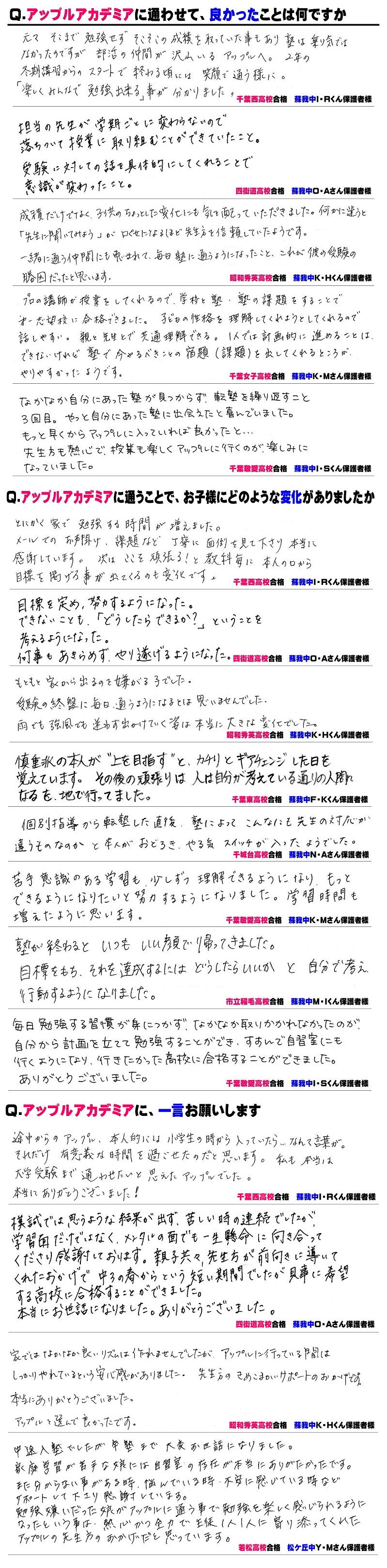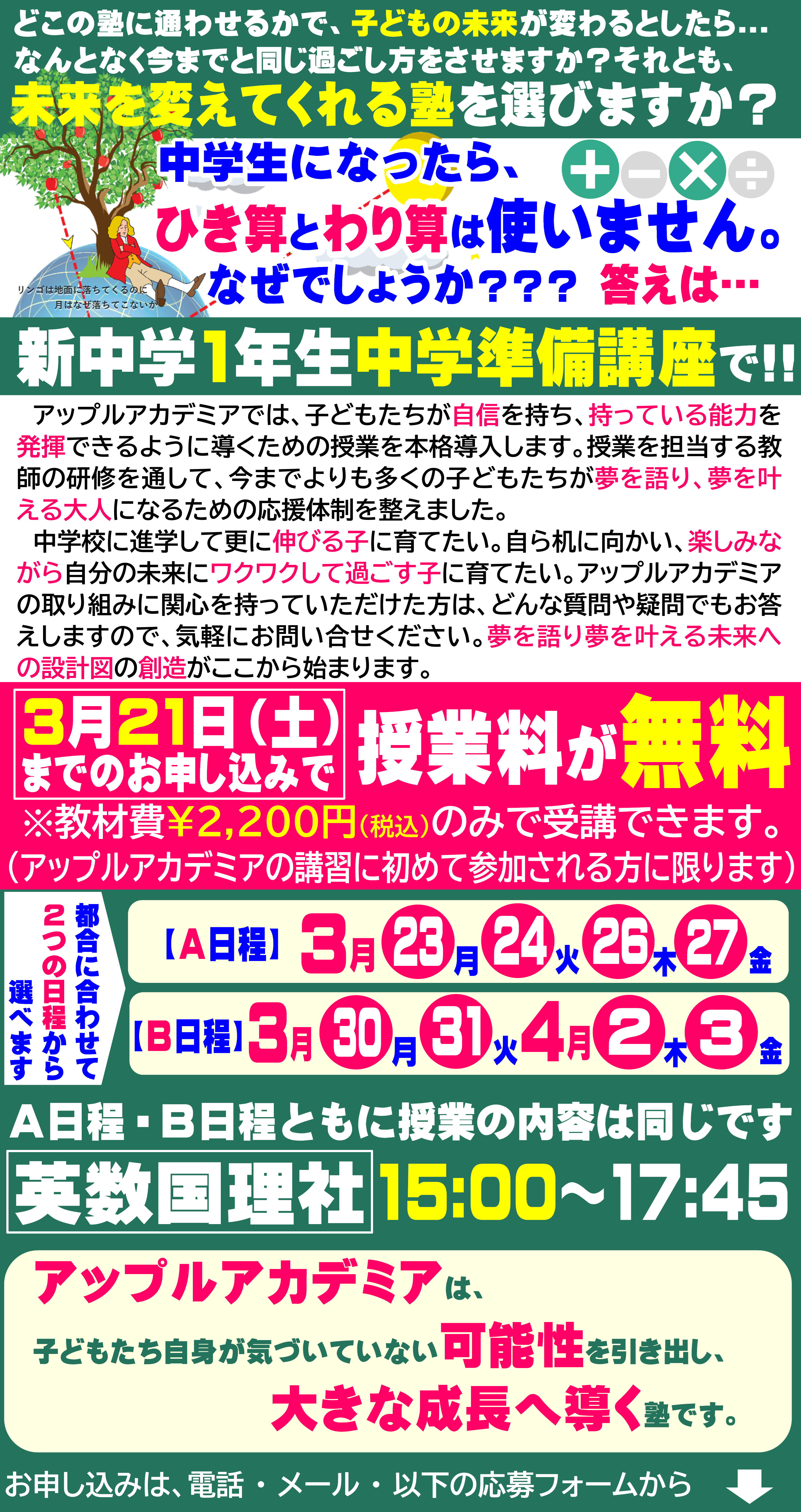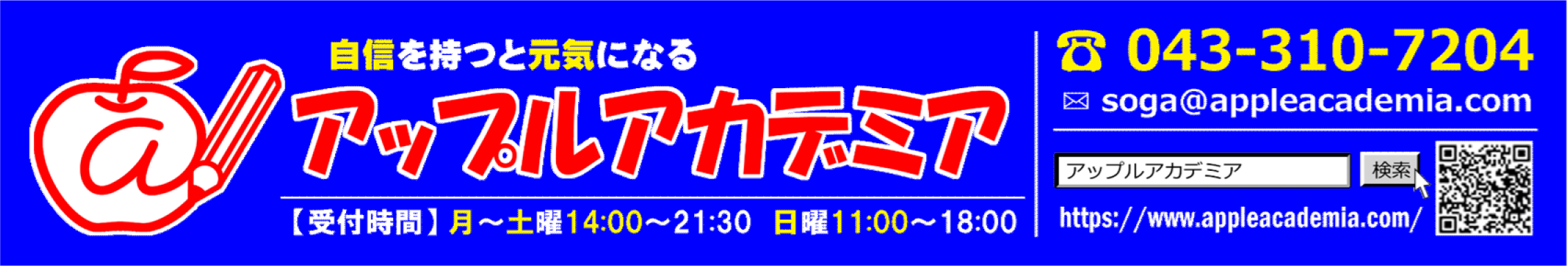 アップルアカデミアは今年で開校11年目を迎えた進学塾です。 「アップルアカデミアに通った子どもたちは夢を語り、夢を叶える大人になる」のミッションのもと、勉強で成果を出すことで自信をつけ、自分の可能性に気づいてもらうことを目指し、日々進化を続けています。 「塾はどこでも同じ」ではありません。「誰に習うか?」で未来は大きく変わります。それゆえ、塾選びで最初に「人」を知ることが重要なのです。 塾選びは大きな、そして大切な選択。この機会にぜひ私たちに触れてください。 我が子の成長をずっと見届けてくれる「人」を探してください。 お問い合わせだけでも構いません。 お気軽にご連絡ください。 楽しみにしております。