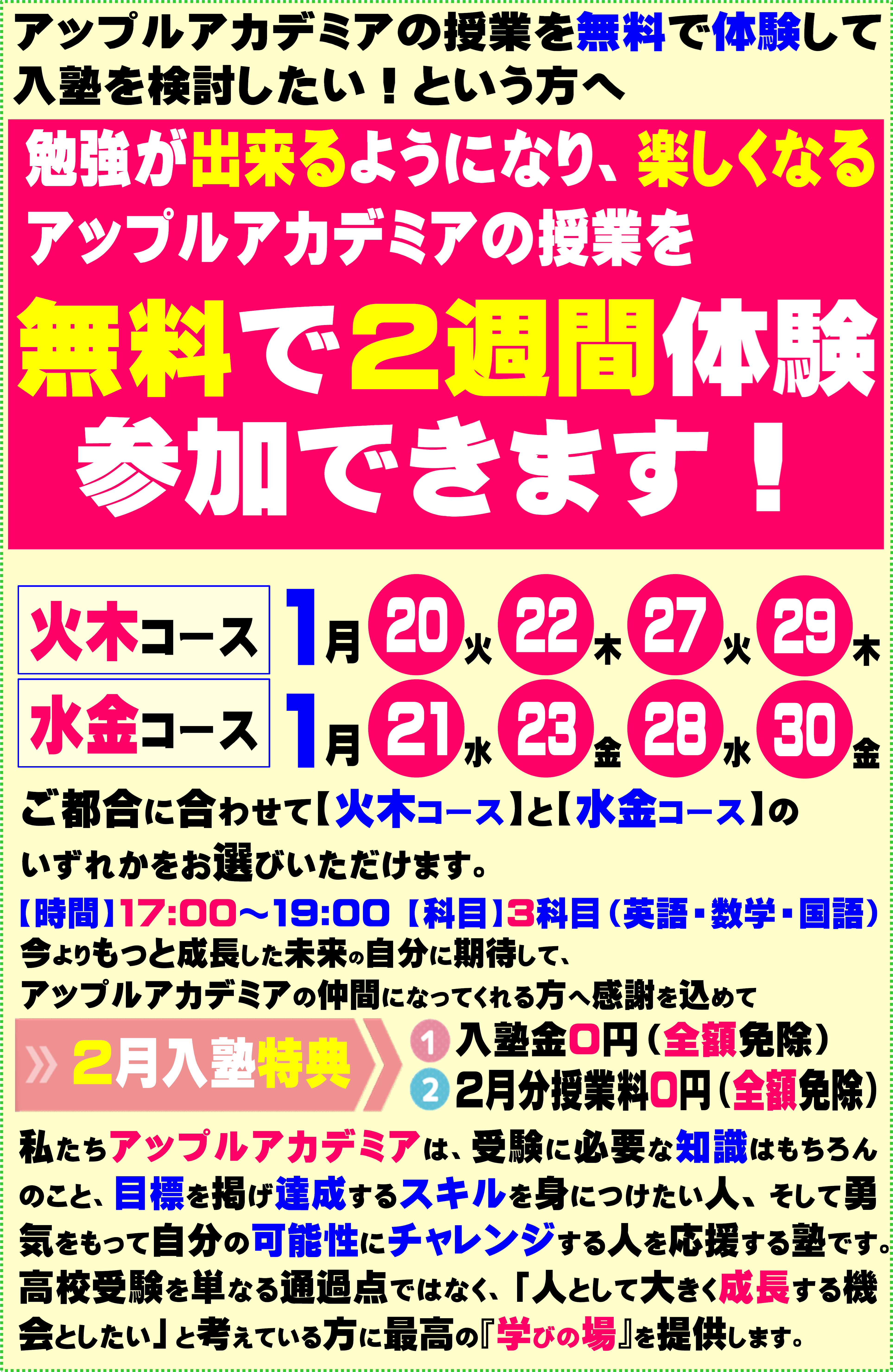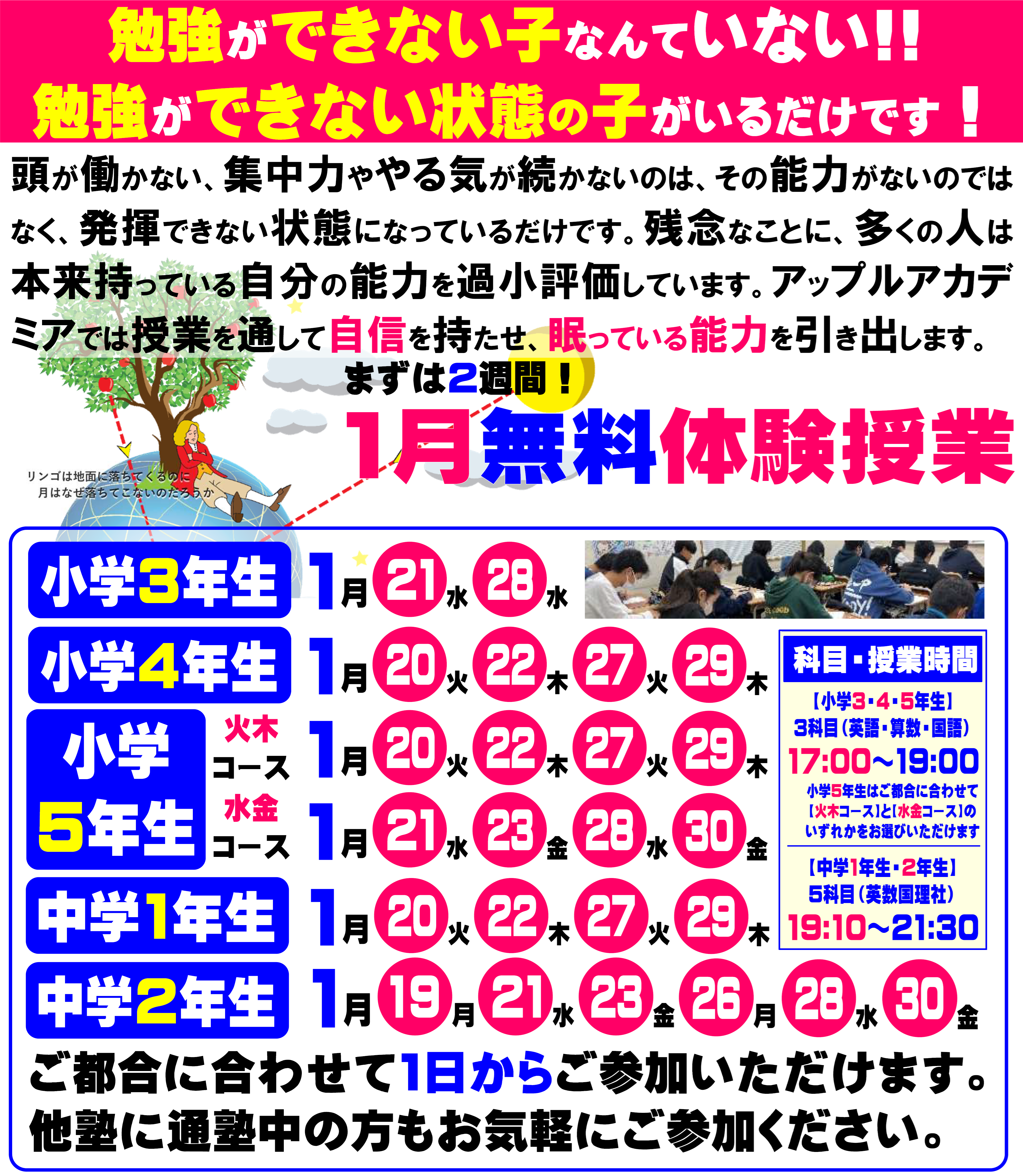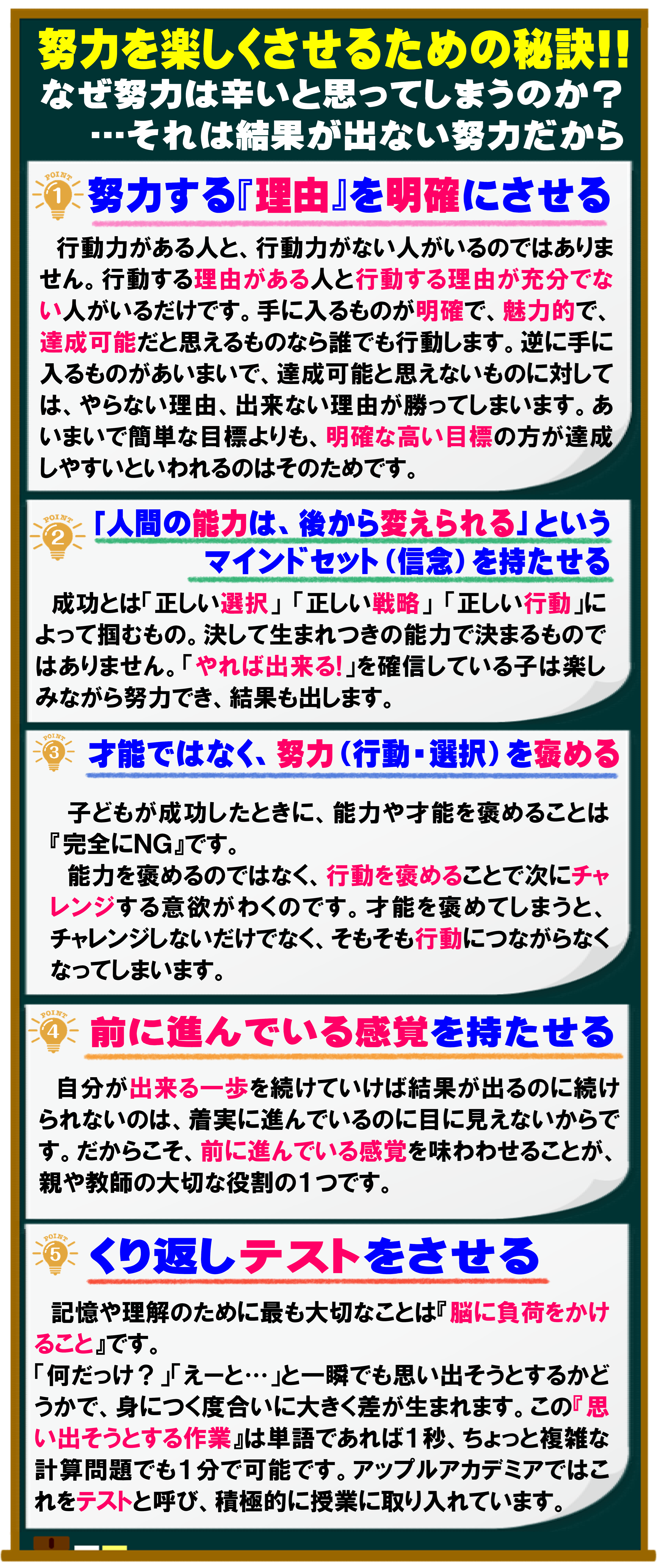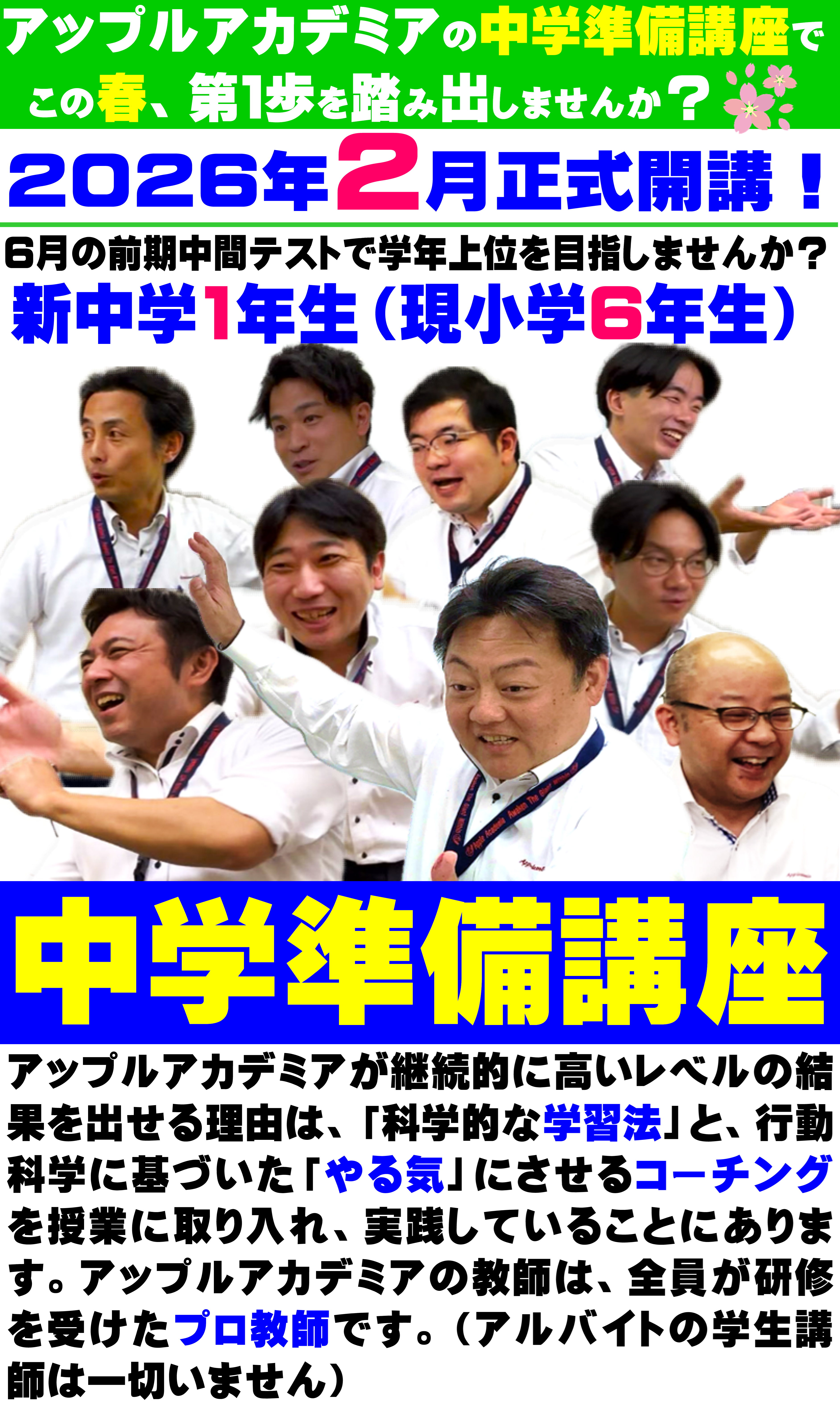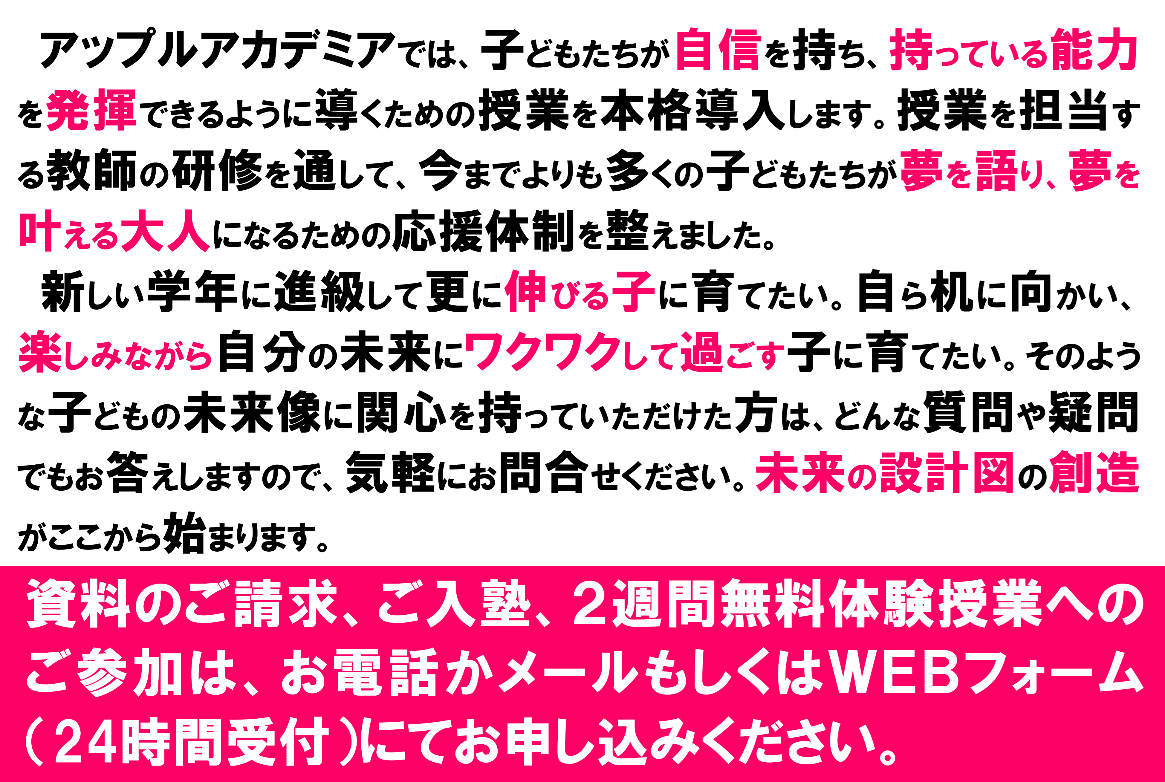 『何となく大手チェーン塾なら大丈夫かな…』 塾はどこも大差ない…ならそうかもしれません。今のまま…は楽かもしれません。アップルは今までの『塾の在り方』から変えたいと思っています。もしステップアップを考えているのなら、違いを試してみる価値は十分にあります。 『質問できないから個別塾へ…』 成績が上がらないのは質問できないからなのでしょうか?質問すれば本当に成績が上がると思いますか?アップルでは質問は生徒ではなく教師がするものと考えています。集団でありながら個を見る。その神髄は教師の質問力にあります。また、アップルで学ぶ多くの子どもたちは、学習を通して『もっと知りたくなる』ので、質問できなかった生徒が積極的に質問に来るようになるのです。 『塾選び』は人生の大切な選択 私たちは「どの塾を選ぶか?」によって、その子がどの高校を目指し、どんな受験を経験するかが変わってくると考えています。少しだけ大げさに言えば、『人生に影響を及ぼす選択』、それが塾選びであると。そんな大切な選択ならば、安易に決定するのではなく、「本当に自分を輝かせてくれる塾は?」という視点で真剣に選ぶ必要があるのではないでしょうか。 『本当は頑張りたい!』 きっかけが欲しい君へ! 私たちは、努力が『出来る人』と『出来ない人』がいる、とは考えていません。努力をする『理由がある人』と『理由がない人』がいるだけなのです。もし、今漠然と「頑張りたいのに頑張れない…」と悩んでいる人は、私たちと一緒に『頑張る理由』を見つけてみませんか?多くの人は『理由』が明確になるだけで、頑張らなくても自然と行動するものです。 アップルアカデミアの生徒が夢中になって勉強し、高い目標をクリアできるのは、私たちが生徒の皆さんに、まず勉強する『理由』を与え、次に勉強の『やり方』を伝えているからです。この順番が成功の秘訣。まず『理由』、次に『やり方』なのです。現状のままでは嫌だ!と何となく不安に感じていたり、きっかけが欲しいと考えている人は、私たちと『勉強する理由』を見つけるところから始めましょう。
