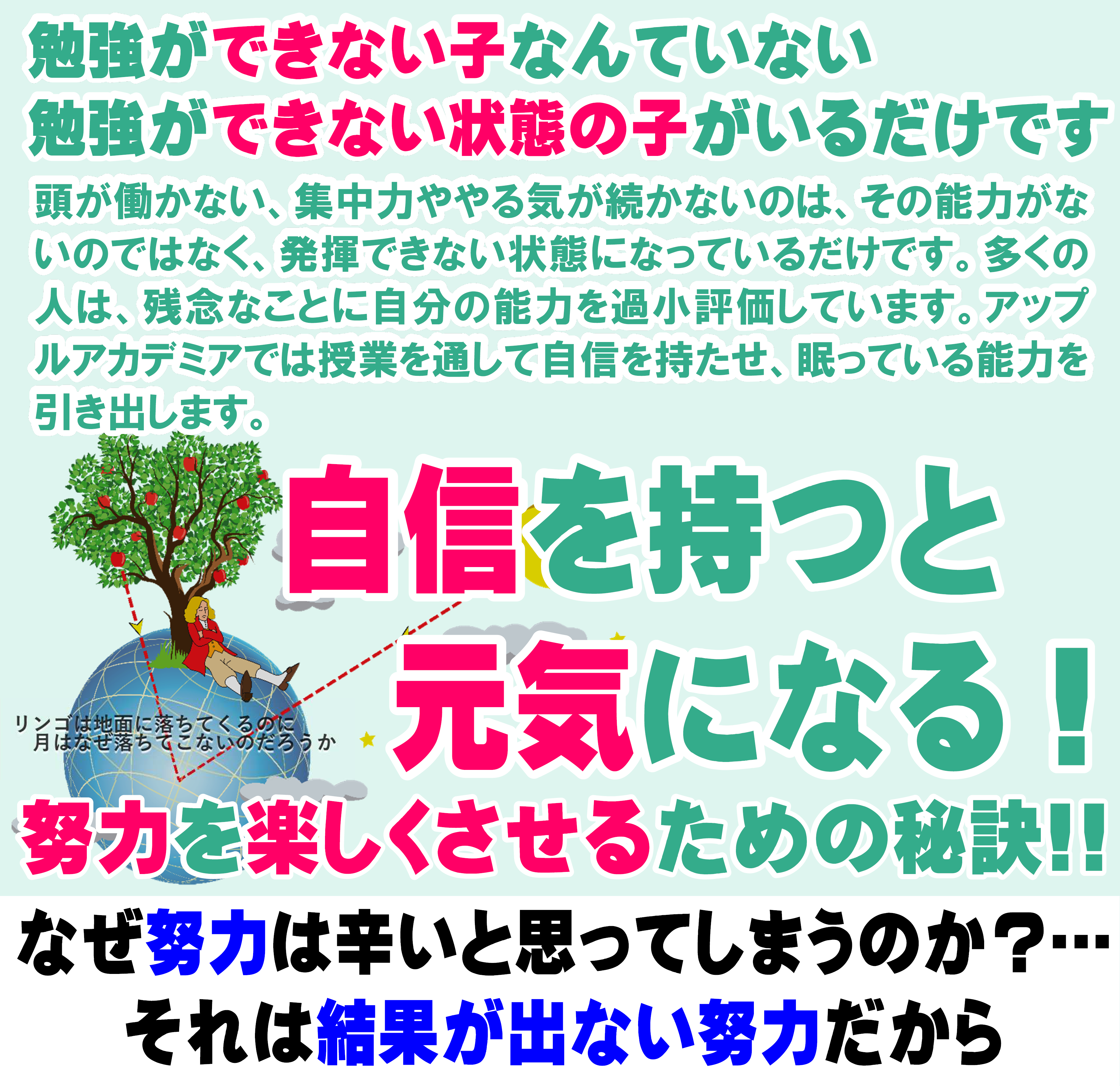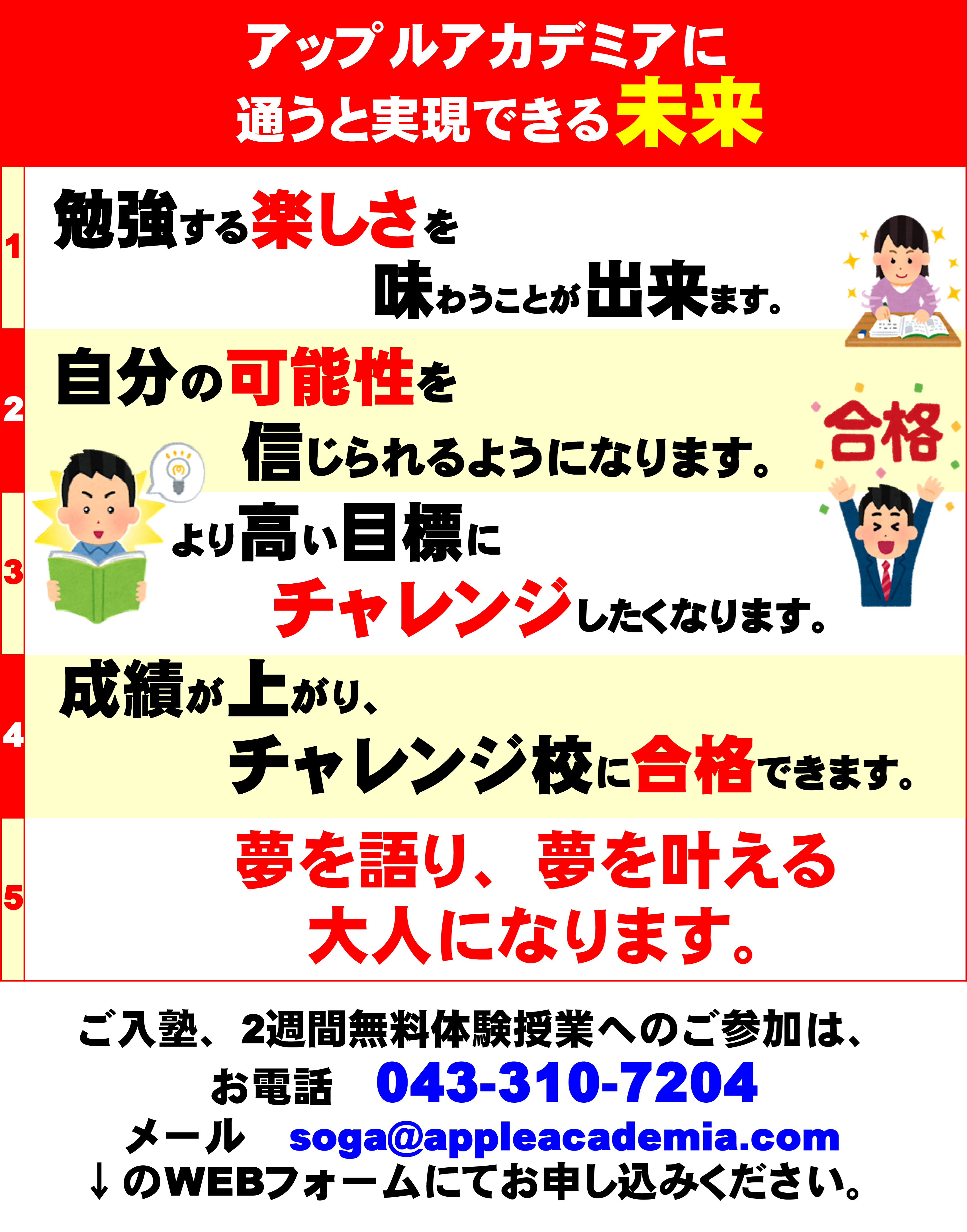 アップルアカデミアは今年で開校11年目を迎えた進学塾です。 「アップルアカデミアに通った子どもたちは夢を語り、夢を叶える大人になる」のミッションのもと、勉強で成果を出すことで自信をつけ、自分の可能性に気づいてもらうことを目指し、日々進化を続けています。 「塾はどこでも同じ」ではありません。「誰に習うか?」で未来は大きく変わります。それゆえ、塾選びで最初に「人」を知ることが重要なのです。 塾選びは大きな、そして大切な選択。この機会にぜひ私たちに触れてください。 我が子の成長をずっと見届けてくれる「人」を探してください。 お問い合わせだけでも構いません。 お気軽にご連絡ください。 楽しみにしております。